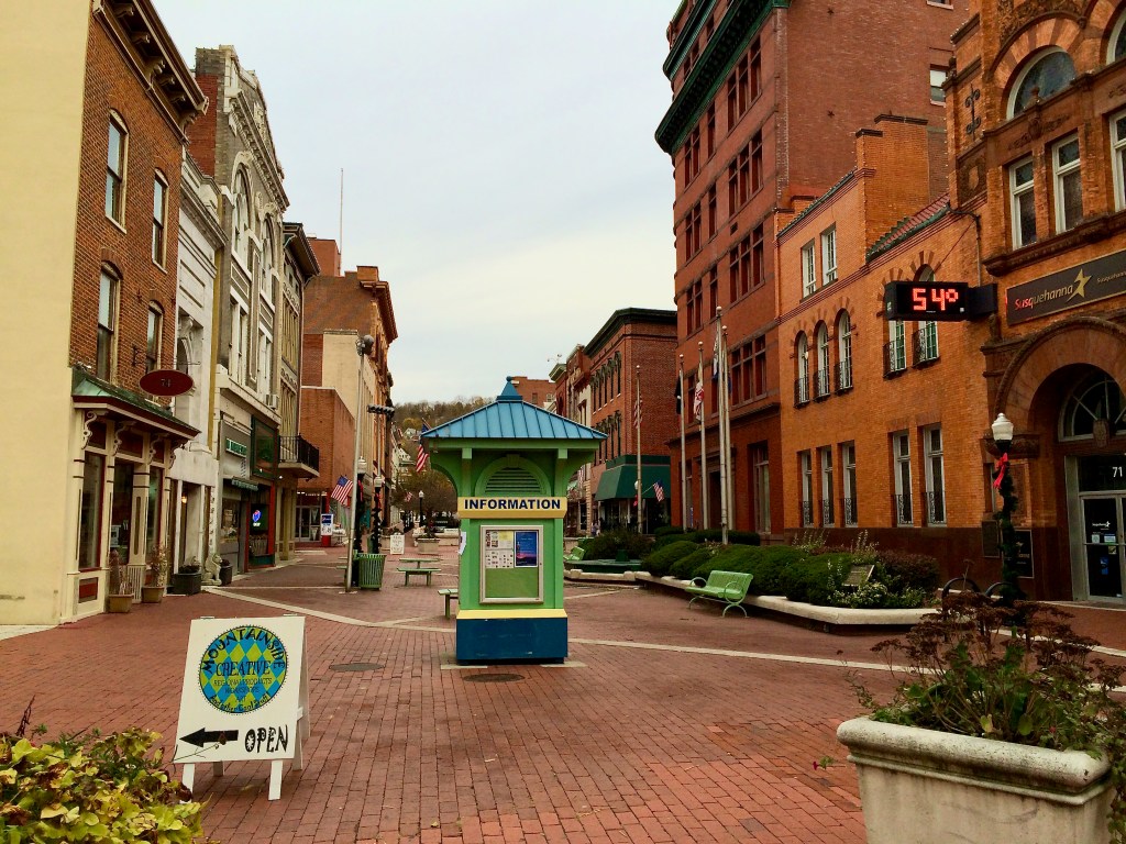 Downtown Cumberland Maryland has distinctive brick architecture and a central square.