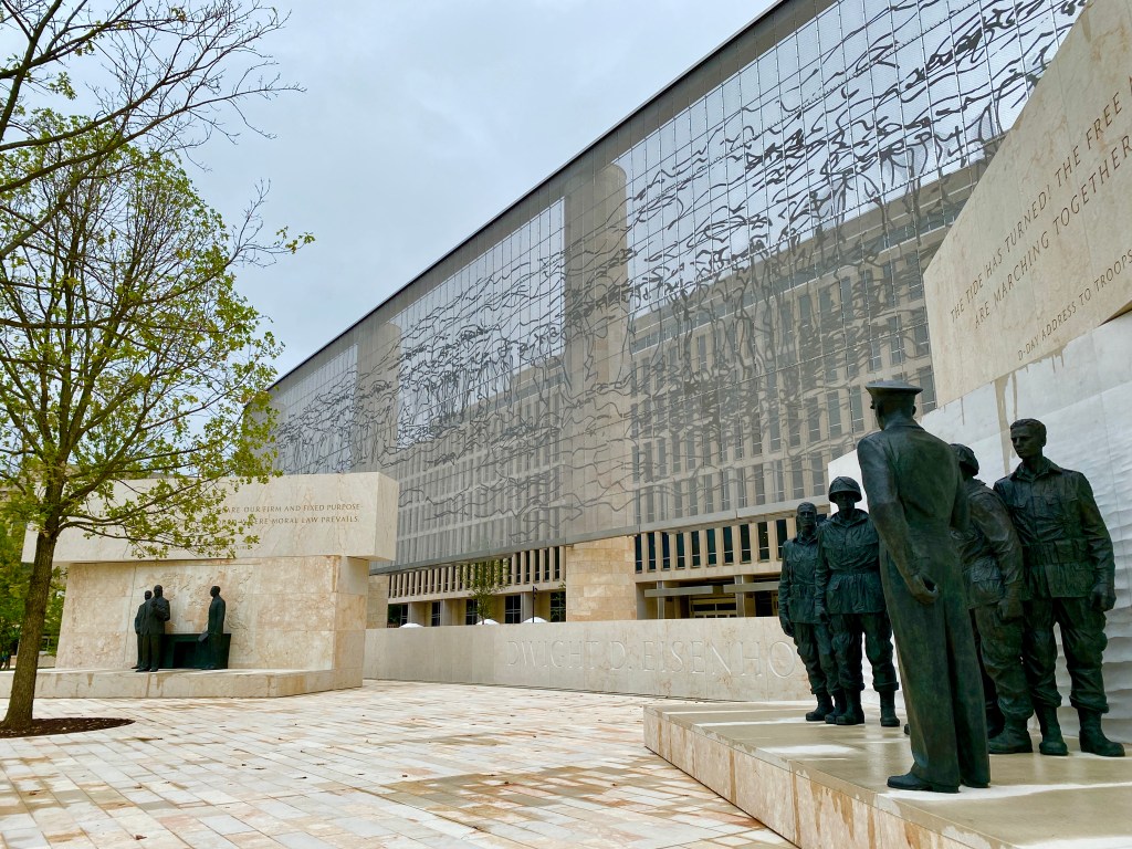 Stop 2: Visit the Newest Presidential Memorial. Stroll around the new Dwight D. Eisenhower Memorial which opened in October of 2020 – you’ll find it across from the Smithsonian Air and Space Museum. Designed by acclaimed architect Frank Gehry, the Eisenhower Memorial features different periods in the former President’s life – his childhood, his military service during World War II and his contributions to Civil Rights and American democracy. Before you walk through, download the audio tour that describes the significance of each section of the memorial. It’s also quite magical at night when the graphic wall behind the statues lights up.