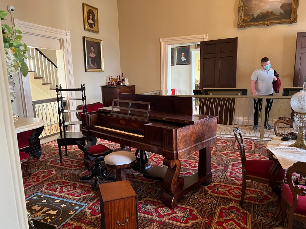 On display are original furnishings and artifacts, including a china set owned by George and Martha Washington. The house is Greek-Revival style and designed by George Hadfield.