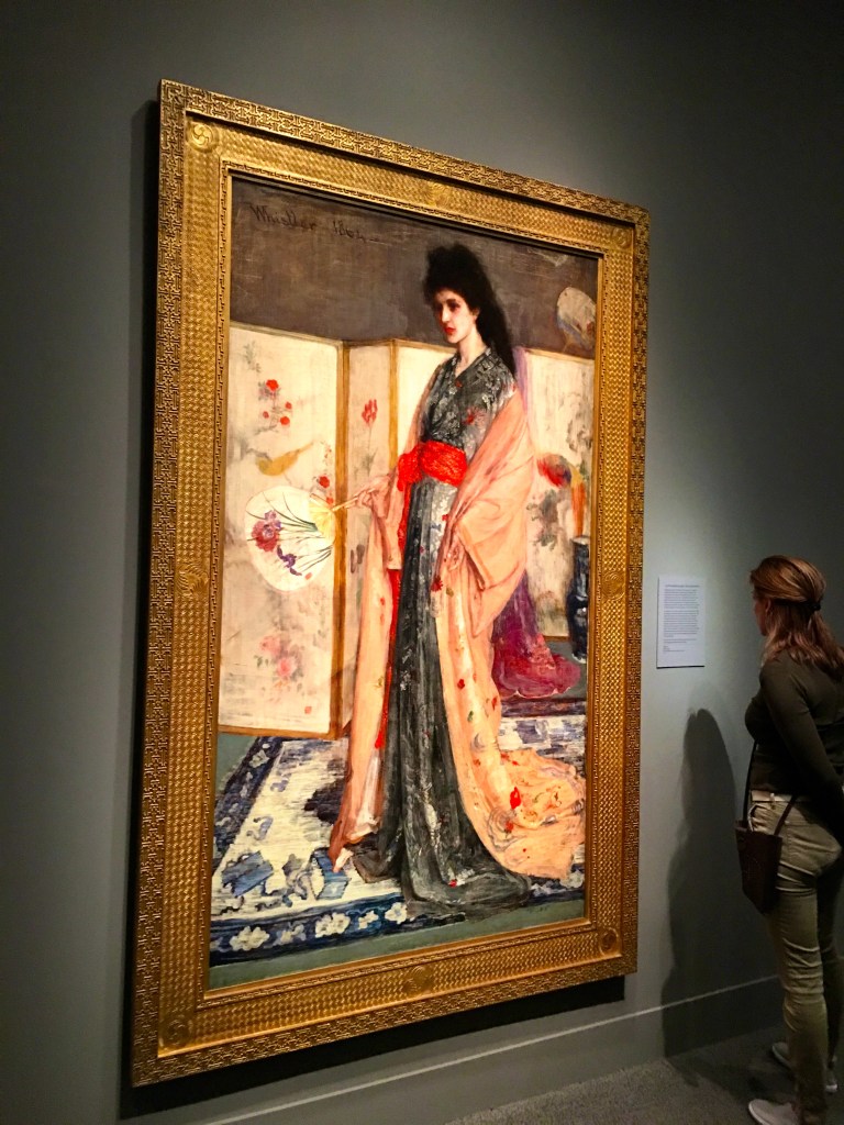 The design and color choices were made mostly by Whistler, and eventually Freer purchased every item, adding ceramics of his own. Central to room is Whistler’s painting Princess from the Land of Porcelain and a mural of frolicking peacocks.