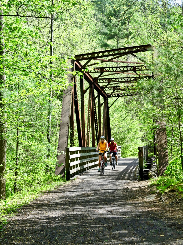 One of the most famous biking trails on the East Coast is the Virginia Creeper Trail in Southwest Virginia. It’s a 34-miles of gentle downhill terrain for much of the ride. The rails-to-trails path begins on Whitetop Mountain and ends in the town of Abingdon. The trail is surrounded by thick forest making most of the ride shady and cool even on the hottest day.
