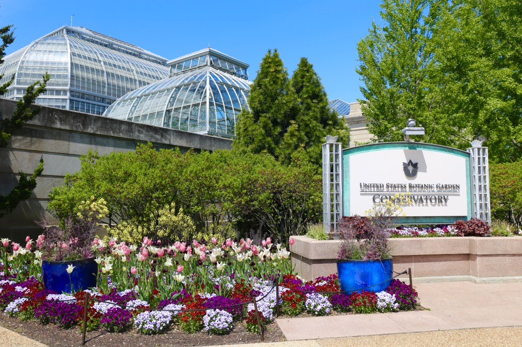 Tulips blooming around Capitol. This is the entrance to the US Botanic Garden Conservatory near the US Capitol.
