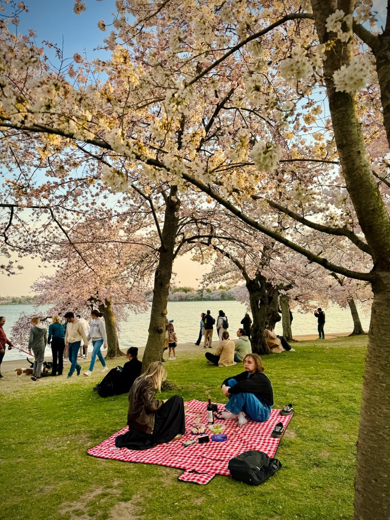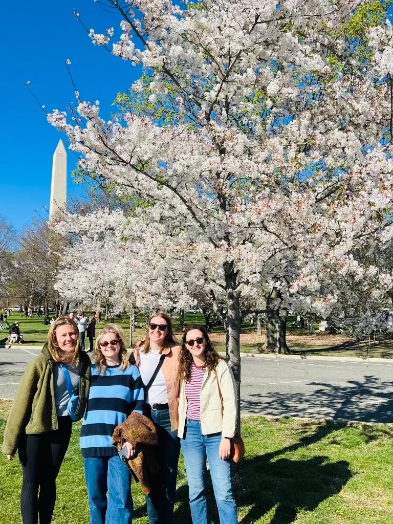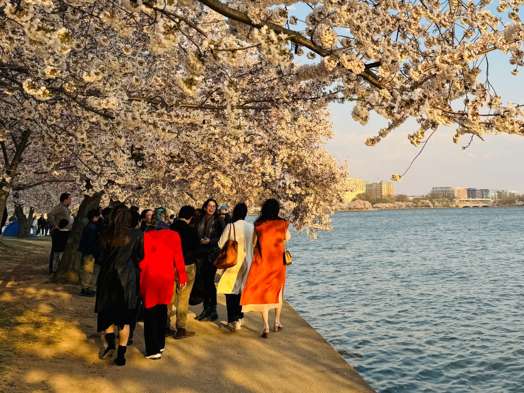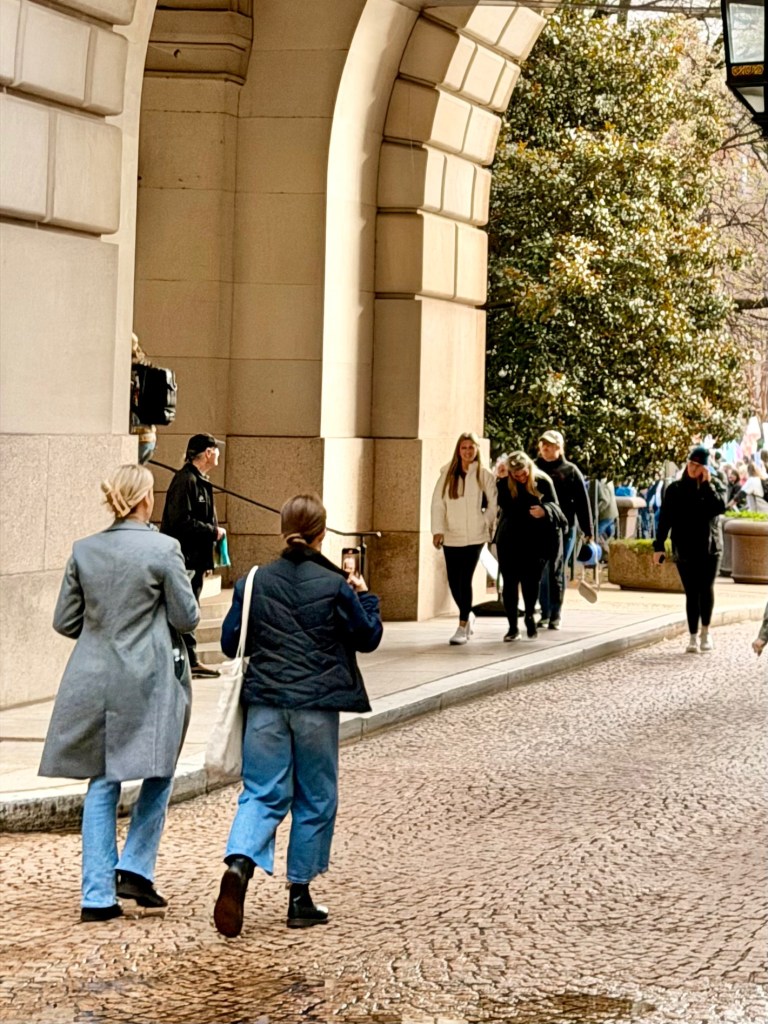 We are excited that our Tidal Basin Seawalk was completed and refreshed. The best place to see the cherry blossoms is the Tidal Basin but there are other great spots: The US Capitol, the US Arboretum, the Kenwood neighborhood in Maryland and the Meadowlark Botanical Garden in Virginia.Jackets or long sleeve shirts are a must when it’s cool and windy. Remember to wear comfortable shoes and watch the crosswalk signs before walking into the street, please.Most spring days have windy, so a tight fitting baseball hat is a good idea for sun and rain.Last year boots with skirts were popular. Too soon to tell this year, but I predict it’ll still be a good option. By late April and May, it warms up nicely, so skirts with sneakers is a great lookShopping on 14th Street. A cross body bag is a practical and stylish choice for a day in the city.I’m a fan of this stripe shirt and fitted leg pant on this gentleman in Dupont Circle.Wide leg jeans are popular in DC.With friends Troy and Richard at a Prosecco wine tasting at the Duck & Peach Restaurant on Capitol Hill. My daughter Danielle and her friends on the National Mall in late March 2025I like the outfits on this stylish older couple near the White House. Disregard the old adage no white until Memorial Day.This spring we are seeing lots of trench and longer coats. Here’s a person waiting for the Metro (which you absolutely should choose instead of driving yourself here)You can bring a picnic to the National Mall (I wouldn’t bring alcohol though). DC is a very casual place except for fine dining and at events, so you will be comfortable in anything.