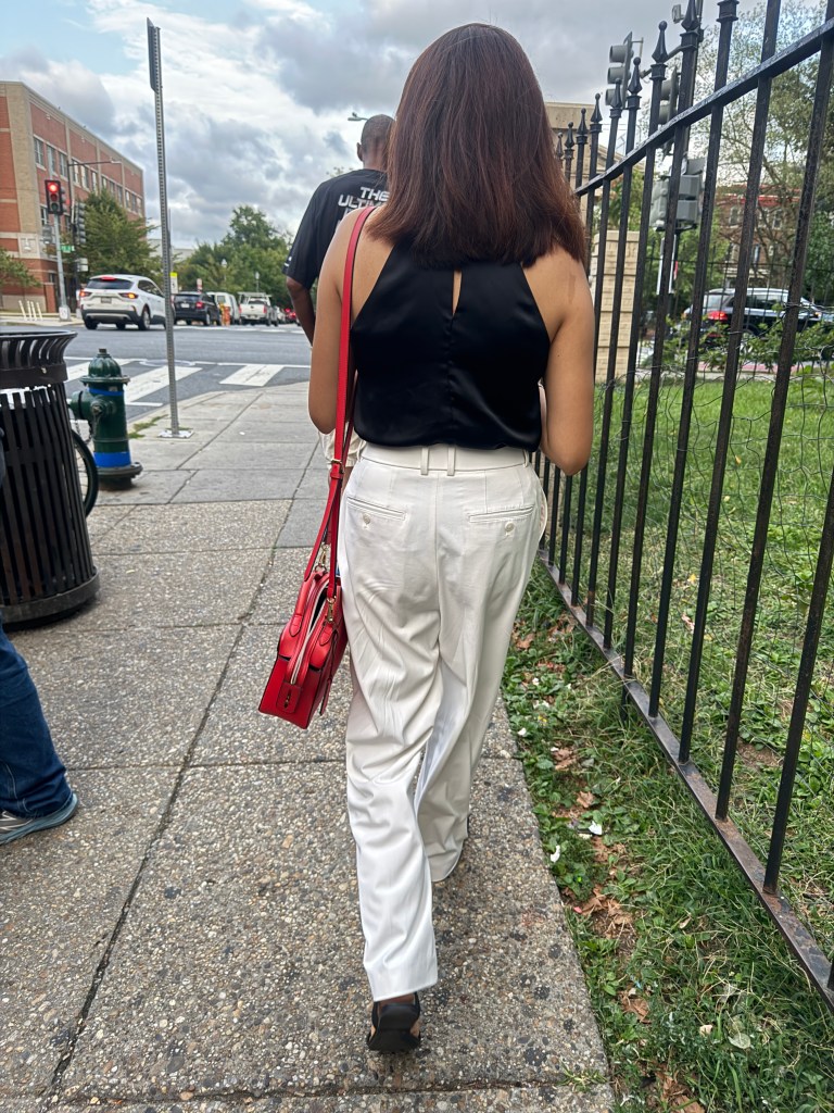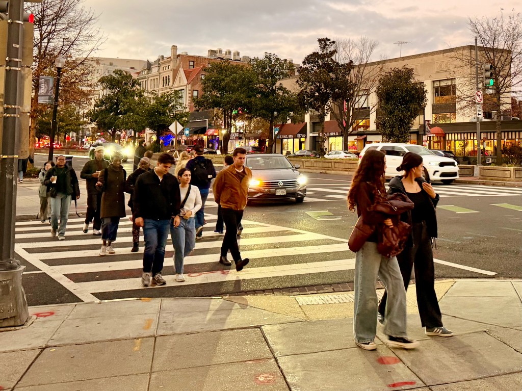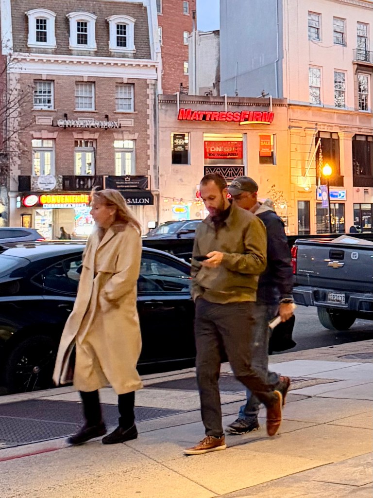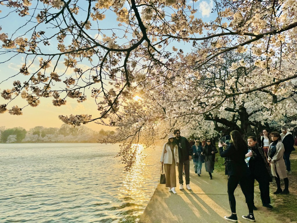 We are excited that our Tidal Basin Seawalk was completed and refreshed. The best place to see the cherry blossoms is the Tidal Basin but there are other great spots: The US Capitol, the US Arboretum, the Kenwood neighborhood in Maryland and the Meadowlark Botanical Garden in Virginia.Jackets or long sleeve shirts are a must when it’s cool and windy. Remember to wear comfortable shoes and watch the crosswalk signs before walking into the street, please.Most spring days have windy, so a tight fitting baseball hat is a good idea for sun and rain.Last year boots with skirts were popular. Too soon to tell this year, but I predict it’ll still be a good option. By late April and May, it warms up nicely, so skirts with sneakers is a great lookShopping on 14th Street. A cross body bag is a practical and stylish choice for a day in the city.I’m a fan of this stripe shirt and fitted leg pant on this gentleman in Dupont Circle.Wide leg jeans are popular in DC.With friends Troy and Richard at a Prosecco wine tasting at the Duck & Peach Restaurant on Capitol Hill. My daughter Danielle and her friends on the National Mall in late March 2025I like the outfits on this stylish older couple near the White House. Disregard the old adage no white until Memorial Day.This spring we are seeing lots of trench and longer coats. Here’s a person waiting for the Metro (which you absolutely should choose instead of driving yourself here)You can bring a picnic to the National Mall (I wouldn’t bring alcohol though). DC is a very casual place except for fine dining and at events, so you will be comfortable in anything.